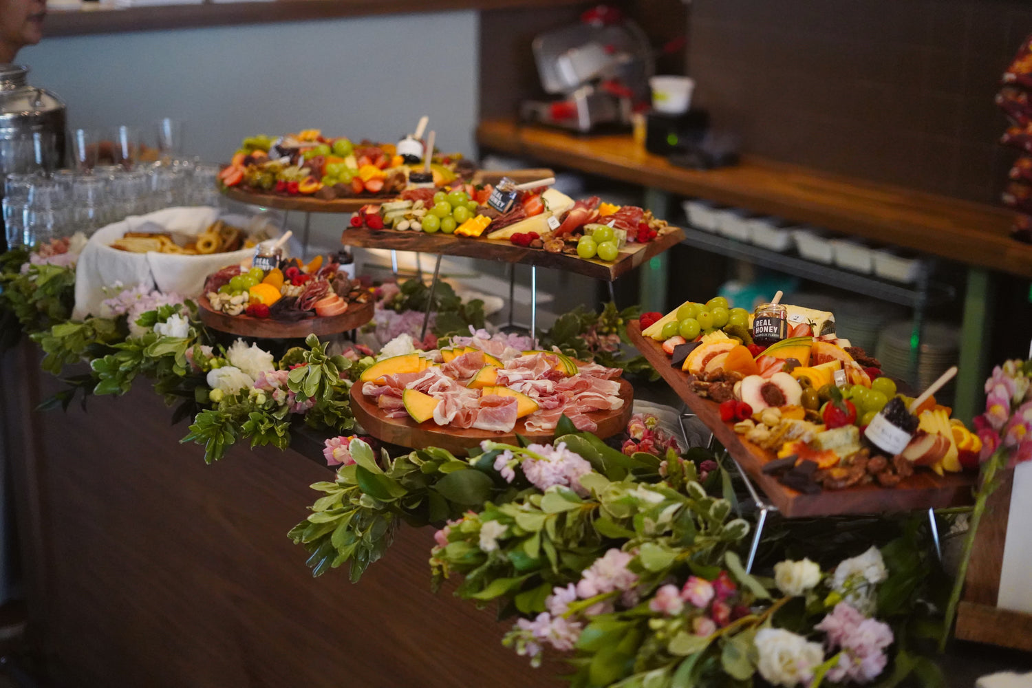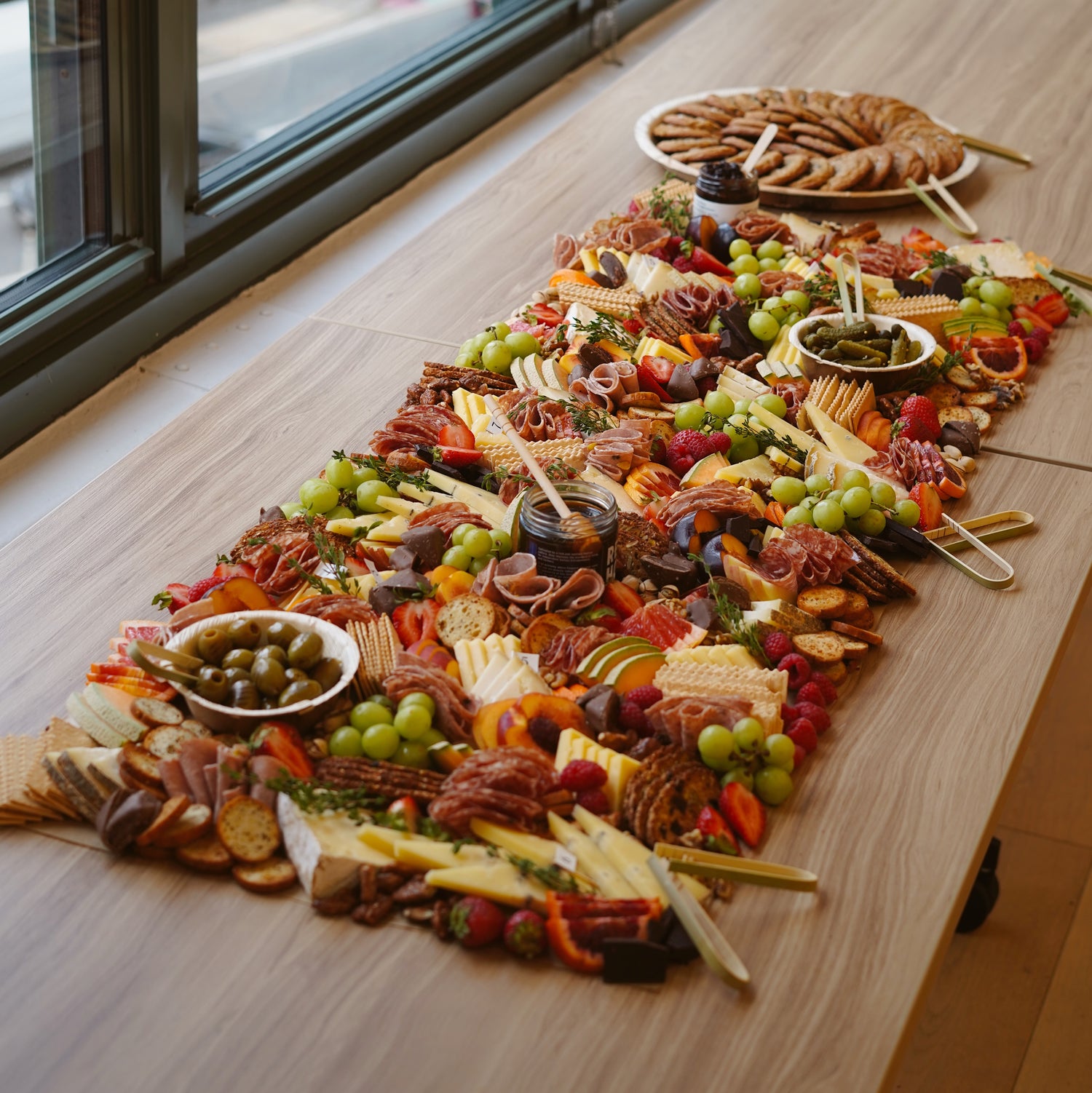 Grazing tables include gourmet cheese selections, charcuterie/ meats, dried fruit, nuts, olives, and various accompaniments, as well as fresh fruit, crackers, breads, and jam to reflect the season of the event.